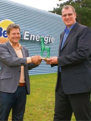 Bei der BeBa-Energie in Hemmingstedt dreht sich alles rund um erneuerbare Energien - von der Photovoltaik über Windkraftanlagen bis hin zu Elektrofahrzeugen. Für das langjährige ökologisch ausgerichtete Engagement und vor allem für die kontinuierliche Weiterentwicklung der Geschäftsfelder erhielt das Dithmarschen Unternehmen jetzt vom Bündnis 90/Die Grünen im Kieler Landtag den Nachhaltigkeitspreis "Grüne Giraffe". "Die Giraffe blickt mit ihrem langen Hals über den Tellerrand und symbolisiert Weitsicht, Zukunftsorientierung und Widerstandsfähigkeit", erklärt Fraktionsvorsitzender Dr. Robert Habeck, der diesen Preis an zwölf Unternehmen im Land vergibt. "Es soll eine Auszeichnung für nachhaltig arbeitende Betriebe sein." Aus Sicht von Habeck ist es für das rohstoffarme Schleswig-Holstein wichtig, mit dem Erfindergeist des Mittelstandes die Zukunft zu meistern.